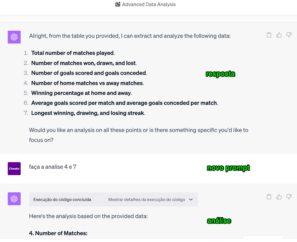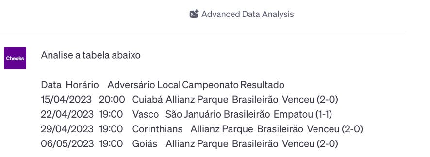 Muitas opções legais acontecem aqui. Por exemplo, escrevi "analise a tabela abaixo" e colei uma tabela sem formatação sobre o histórico de resultados do Palmeiras em 2023 (copiei de uma fonte e colei diretamente no prompt), conforme figura 9.