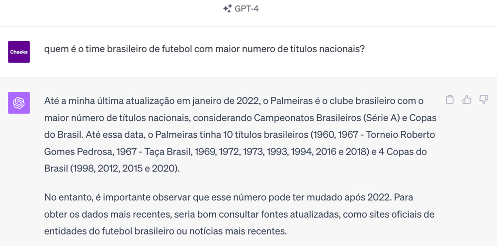 Este é o modo padrão do GPT-4, onde você pode fazer perguntas ou solicitar tarefas específicas, e o modelo responderá com base no conhecimento que foi treinado. É útil para perguntas gerais, redação criativa, geração de código, tradução, entre outras tarefas. Na figura 4 fiz uma pergunta geral sobre futebol. Observe que os dados descritos ocorreram até janeiro 2022. E se você quiser informações atualizadas? Na sequência, vamos para o item 2 que falarei sobre isso.