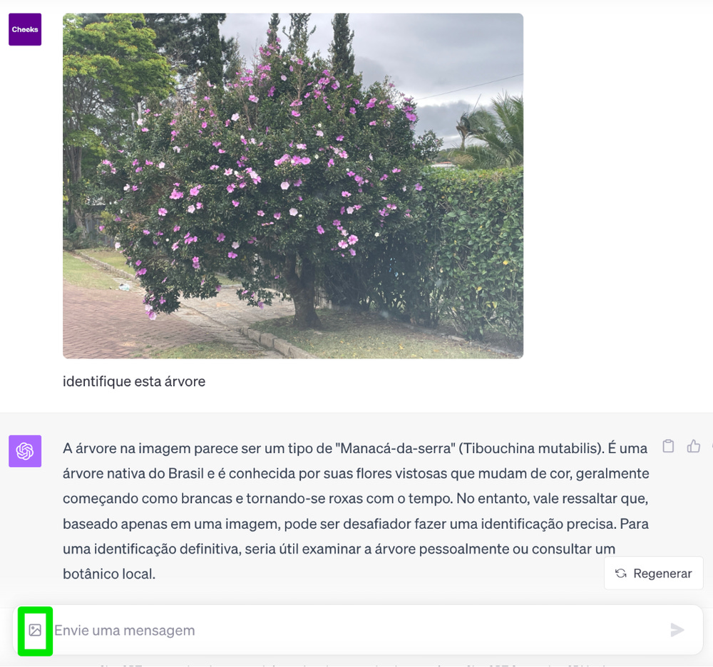 Outra coisa legal que ele pode fazer utilizando fotos é identificar árvores, te dar o passo a passo para consertar um pneu e até alguns diagnósticos simples de imagens médicas (mas claro, procure sempre um médico especialista). Para subir imagens ao ChatGPT-4 basta clicar no ícone conforme mostrado na figura 6.