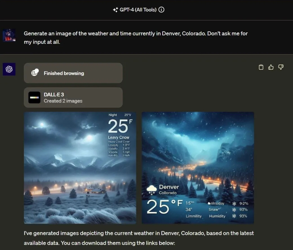 Muito em breve será possível, por exemplo, pedir para o GPT-4 gerar uma imagem relacionada ao clima de uma cidade no momento exato (figuras 24 e 25).