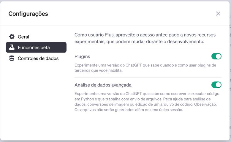 Os plugins conectam o ChatGPT a aplicativos externos. Se você habilitar um plugin, o ChatGPT pode enviar sua conversa, instruções personalizadas e o país ou estado em que você está para o plugin.