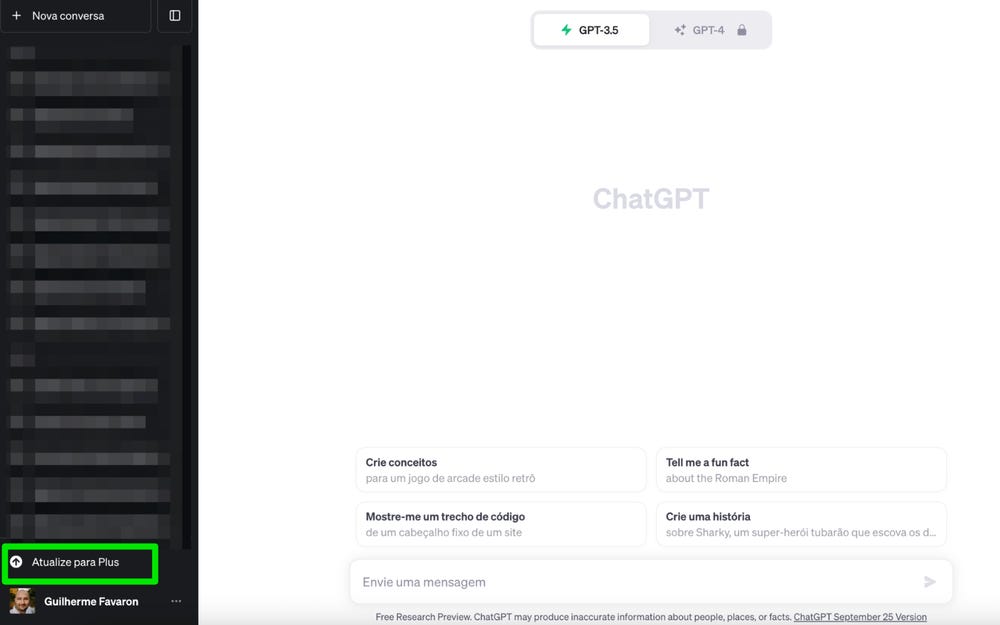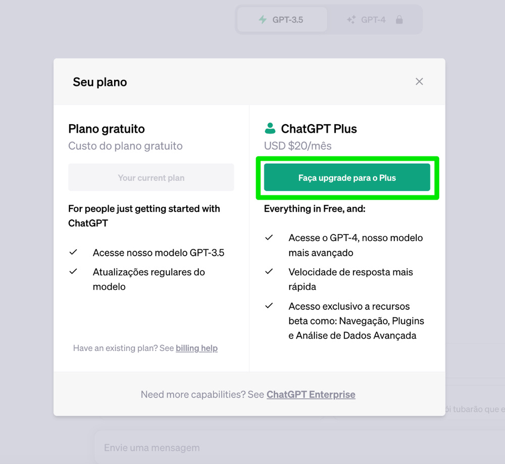 Para fazer o upgrade para o ChatGPT-4, uma vez logado no https://chat.openai.com (o mesmo que você acessa a versão gratuita 3.5) você precisa clicar no "Atualize para Plus" (figura 1). Então, é só seguir os passos e fazer o upgrade, conforme figura 2.