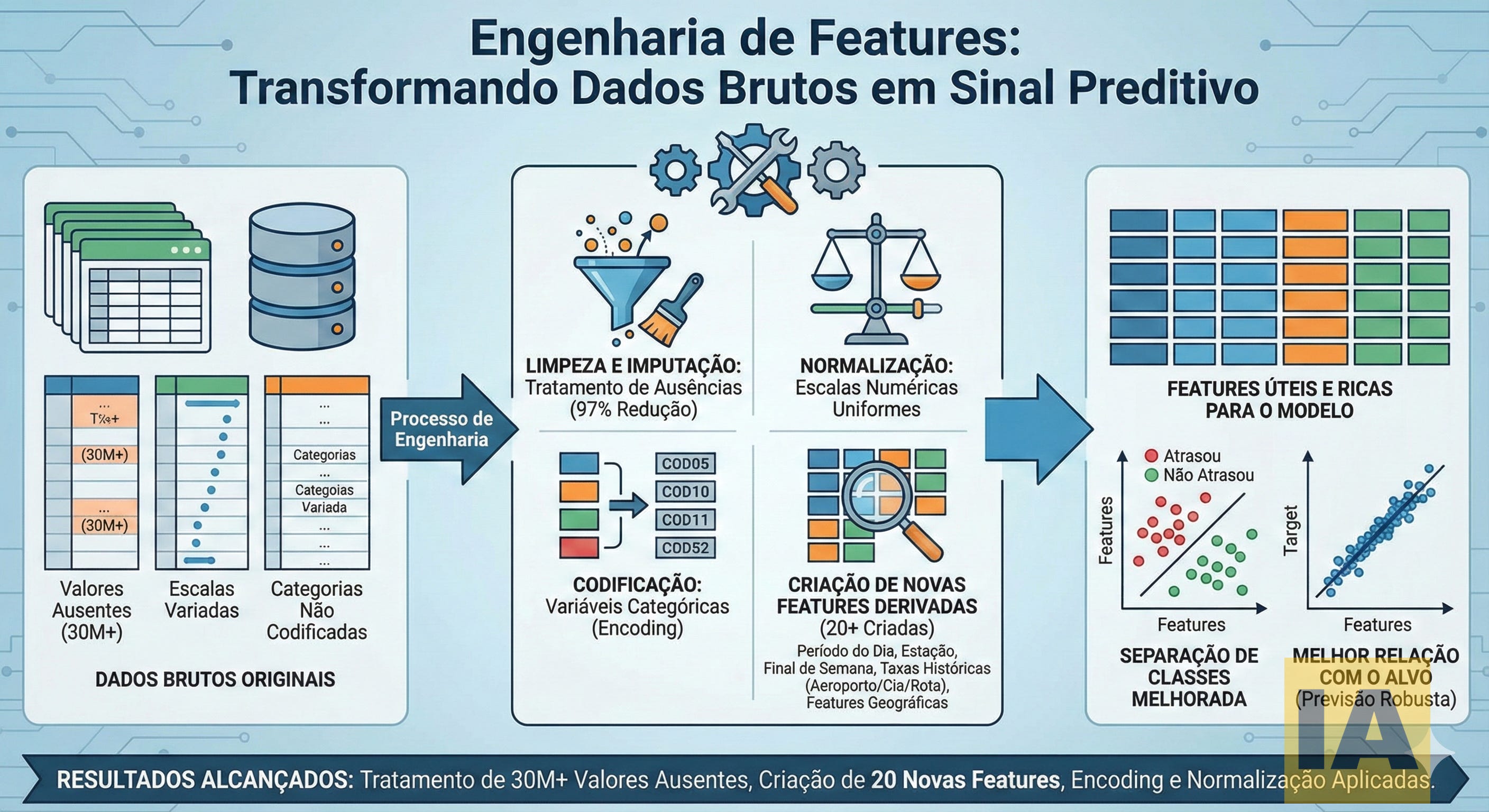 Engenharia de features transforma dados brutos em variáveis úteis para algoritmos de ML. O processo inclui limpeza de dados ausentes, normalização de escalas, codificação de categorias e criação de novas variáveis derivadas. No projeto, foram tratados mais de 30 milhões de valores ausentes (redução de 97%) e criadas 20 novas features, incluindo período do dia, estação, taxas históricas de atraso e características geográficas.