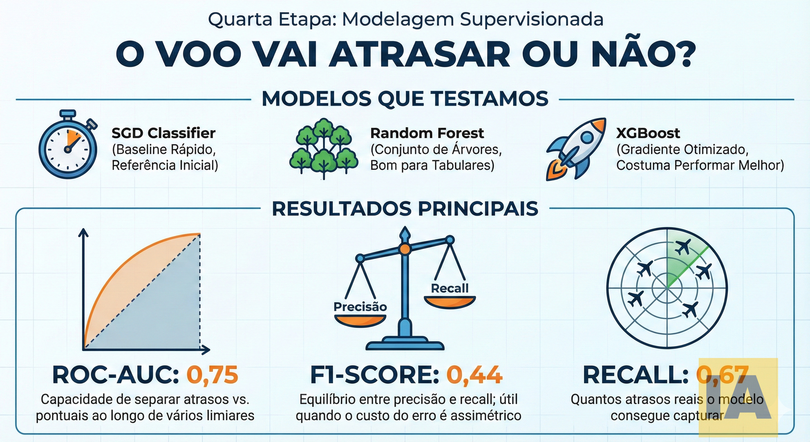 Para classificação binária (atraso sim/não), três modelos foram testados: SGD Classifier como baseline rápido, Random Forest (conjunto de árvores) e XGBoost (gradiente otimizado). O melhor resultado alcançou ROC-AUC de 0,75, F1-Score de 0,44 e Recall de 0,67. Isso significa que o modelo consegue capturar 67% dos atrasos reais, com boa separação entre classes.