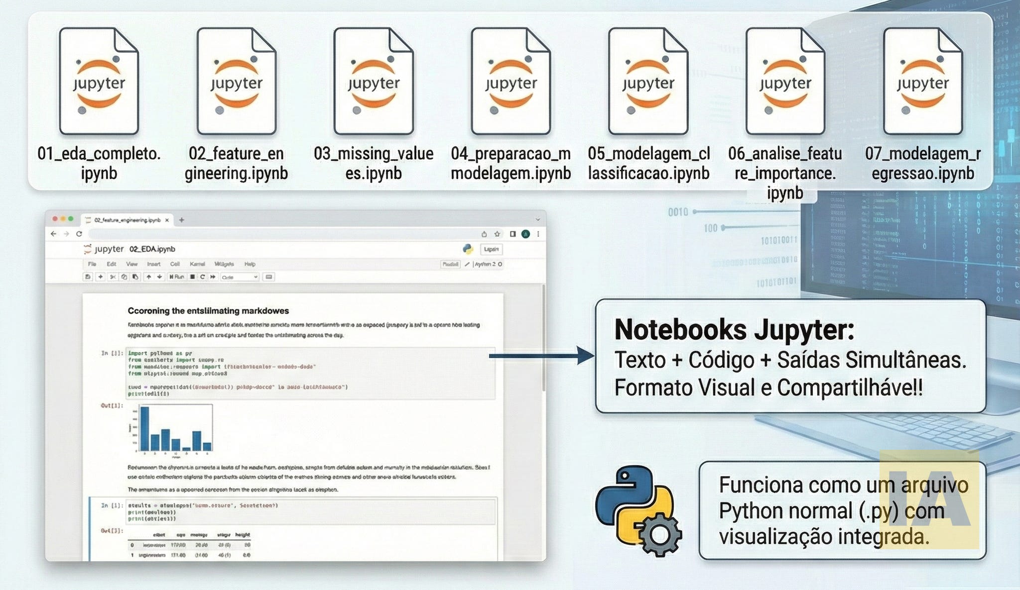 Os Notebooks Jupyter são particularmente úteis nesse contexto porque permitem combinar texto explicativo com código executável, mantendo as saídas de cada função visíveis. Isso facilita a documentação e o compartilhamento do trabalho.