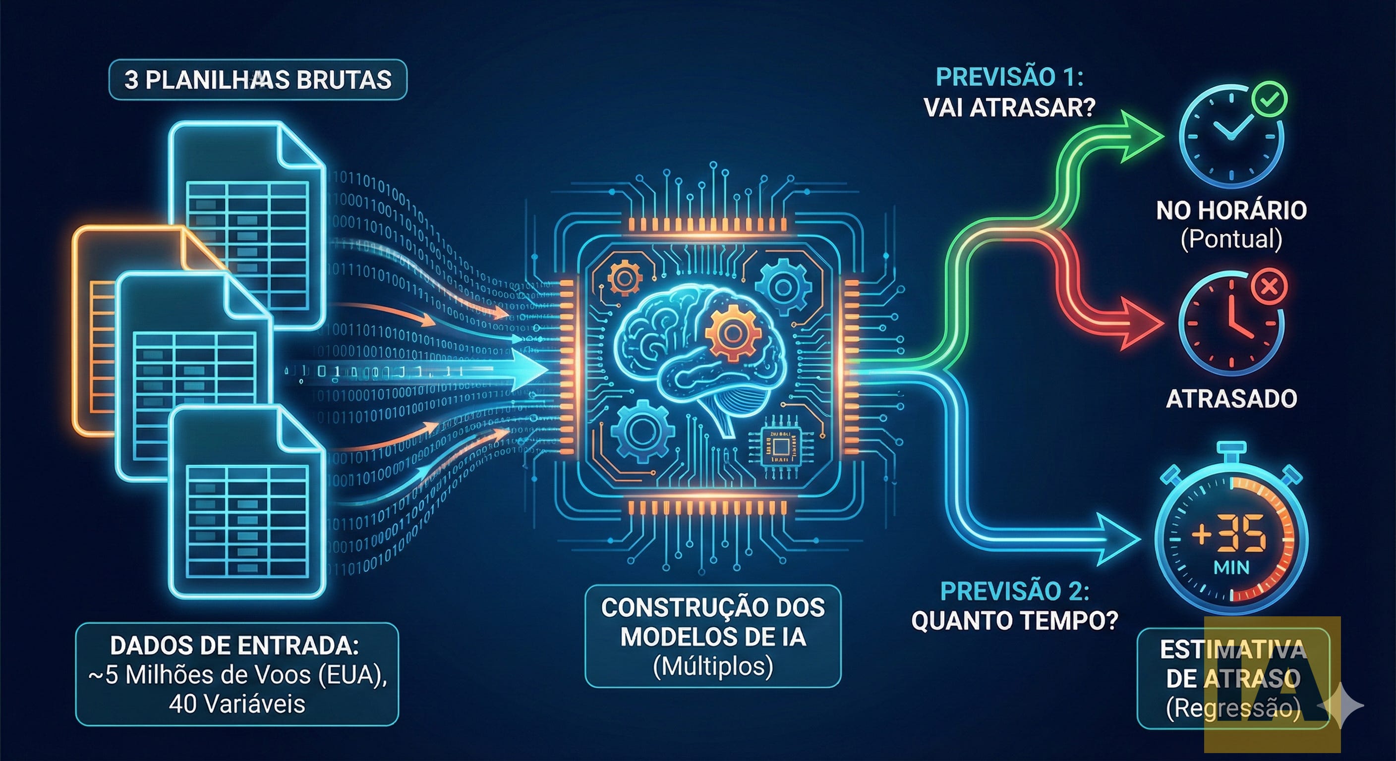 No caso demonstrado neste artigo, três planilhas com aproximadamente 5 milhões de voos dos Estados Unidos e 40 variáveis servem como base para prever duas coisas: se um voo vai atrasar (classificação binária) e quanto tempo vai atrasar (regressão).