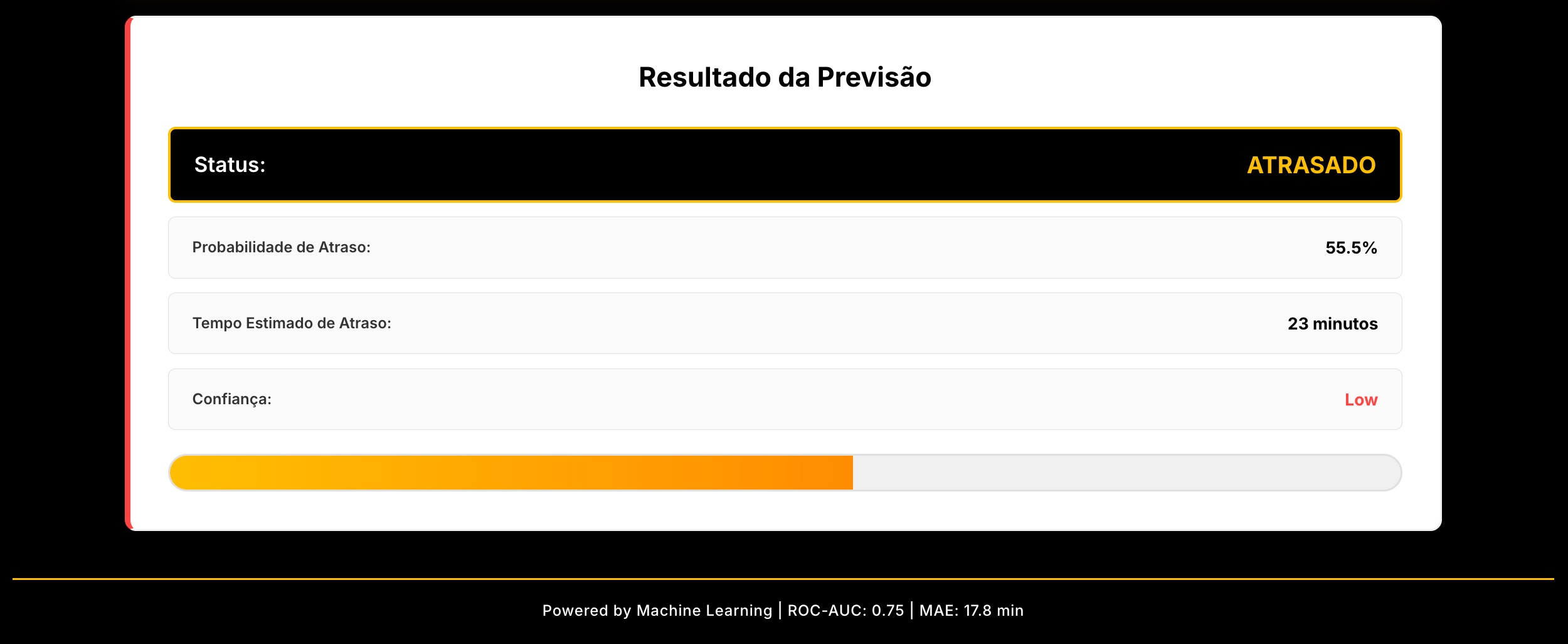 O resultado apresenta tanto a classificação (atrasado ou pontual) quanto, no caso de previsão de atraso, o tempo estimado em minutos. Isso dá ao usuário informação acionável para tomada de decisão.