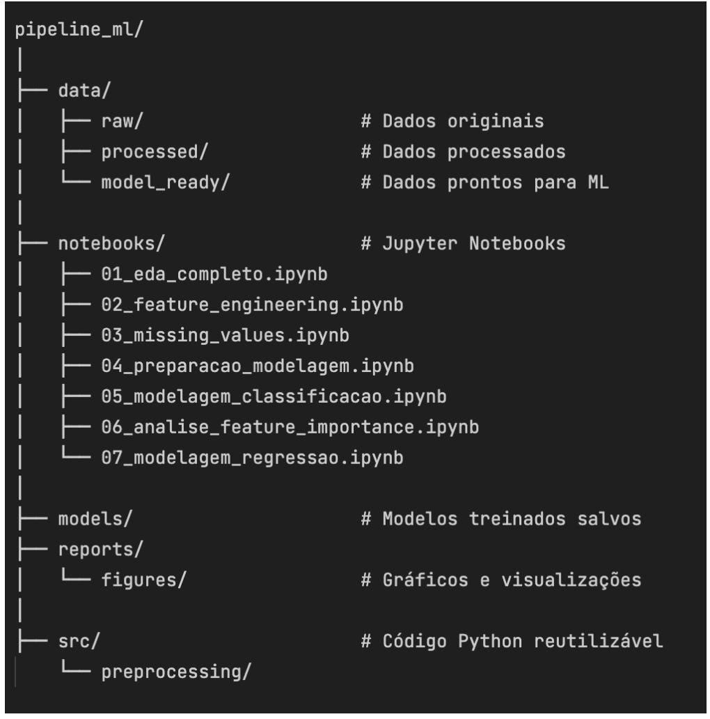 Um projeto de ML bem organizado segue uma estrutura de pastas que separa dados brutos, processados e prontos para modelagem. Os notebooks Jupyter contêm o código e suas saídas documentadas. A pasta de modelos armazena os algoritmos treinados. Relatórios guardam visualizações, e arquivos auxiliares ficam em uma pasta de código-fonte separada.