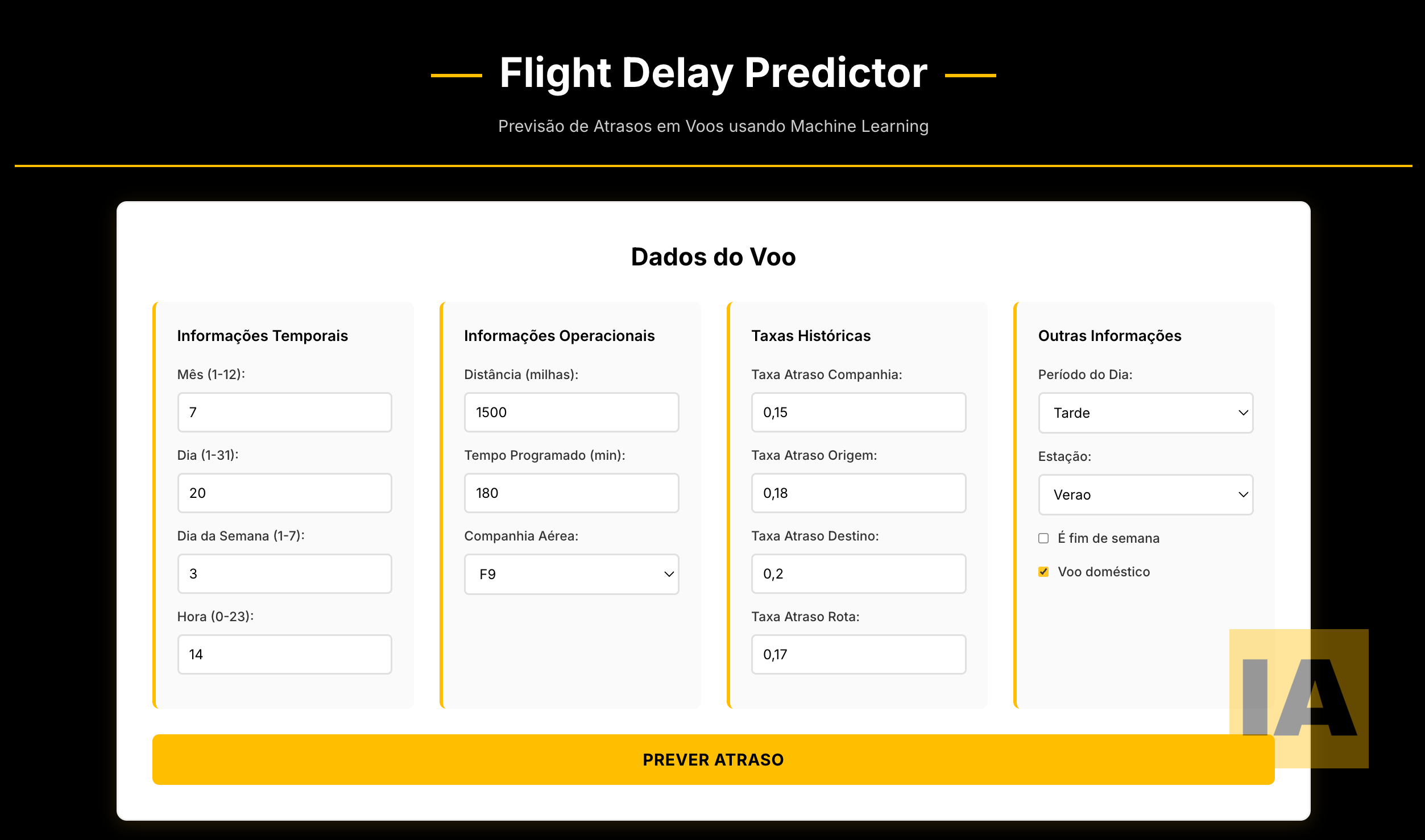 A interface permite que usuários não-técnicos interajam com o modelo sem precisar escrever código. Cada feature pode ser ajustada individualmente: companhia aérea, aeroportos de origem e destino, horário do voo, dia da semana, entre outras.