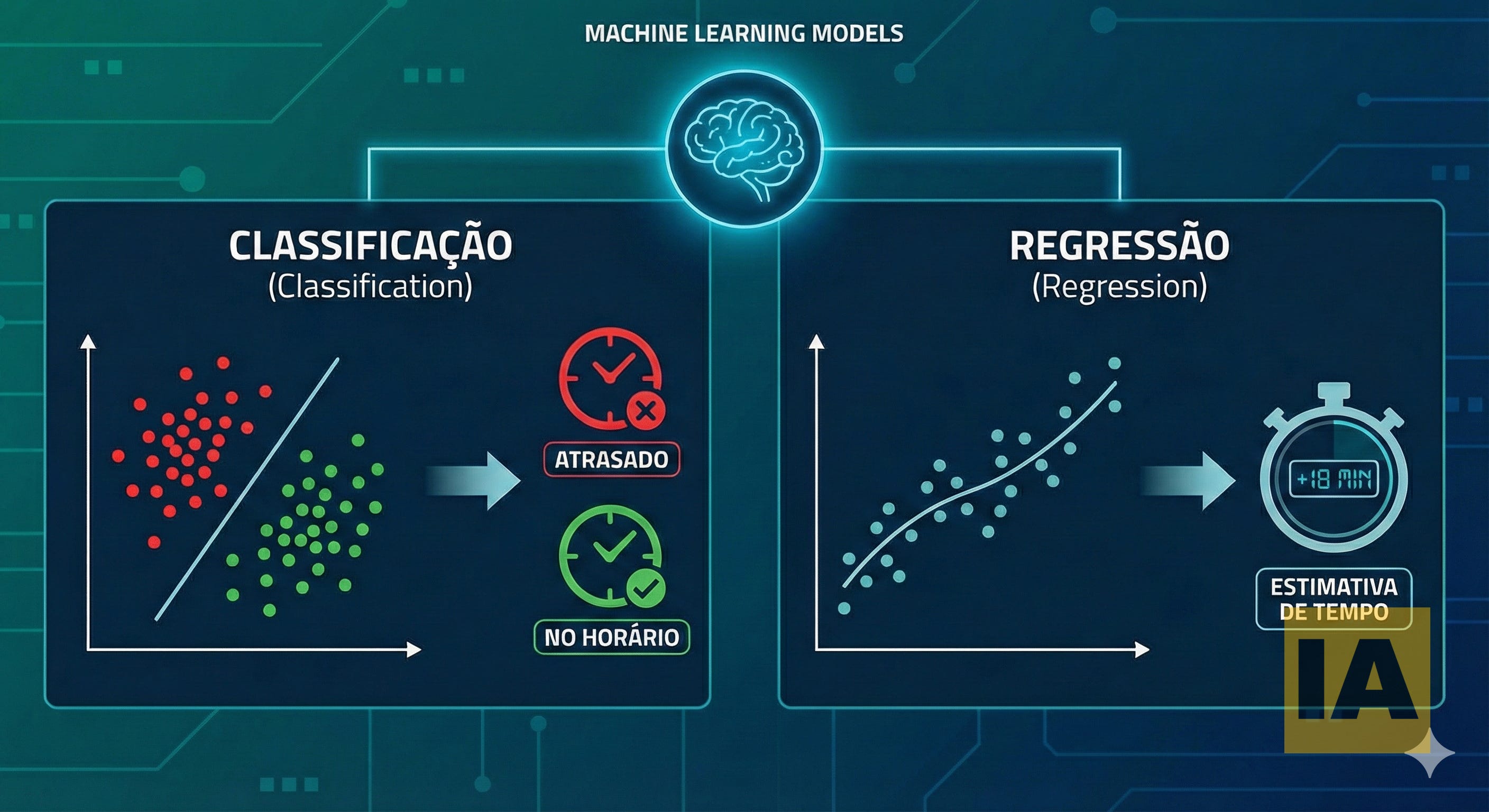 A imagem ilustra essa distinção fundamental. No lado esquerdo, o modelo de classificação traça uma fronteira de decisão que separa os pontos vermelhos (atrasos) dos verdes (no horário). O resultado é categórico: sim ou não.