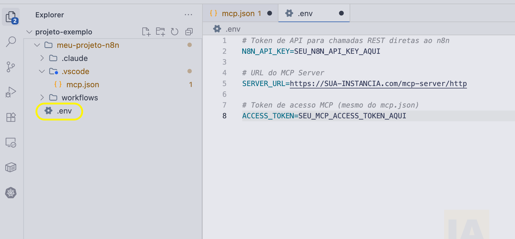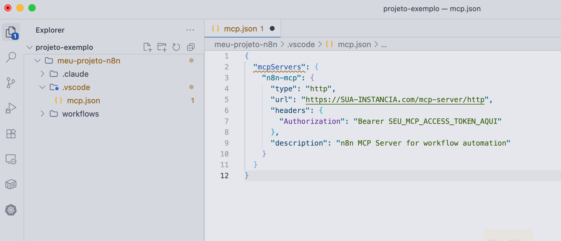 O arquivo mcp.json é o coração da integração. Ele informa ao VS Code como se conectar ao servidor MCP do N8N.