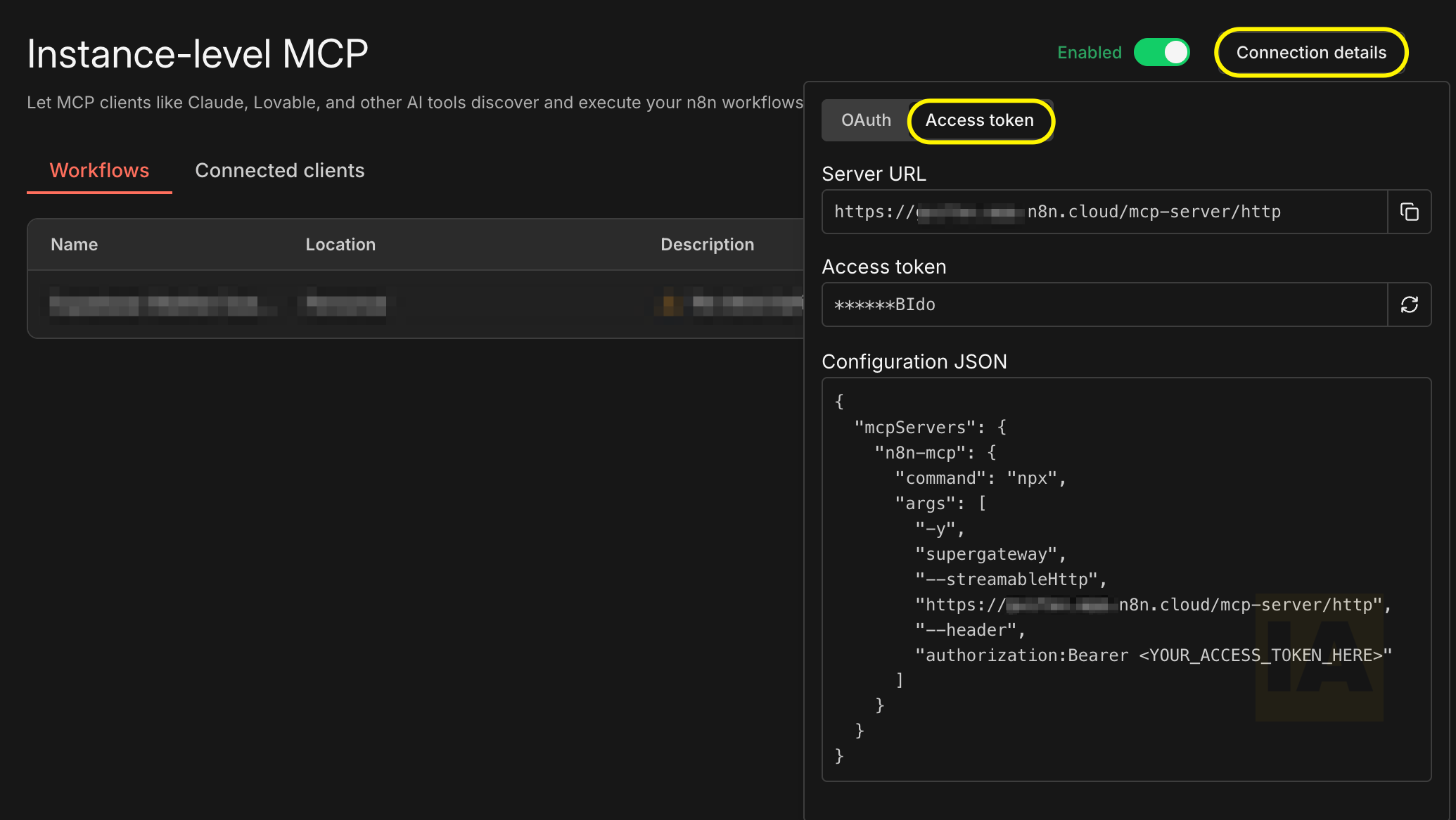 Essa opção permite habilitar o acesso MCP em nível de instância, ou seja, qualquer ferramenta configurada corretamente poderá interagir com seus workflows.