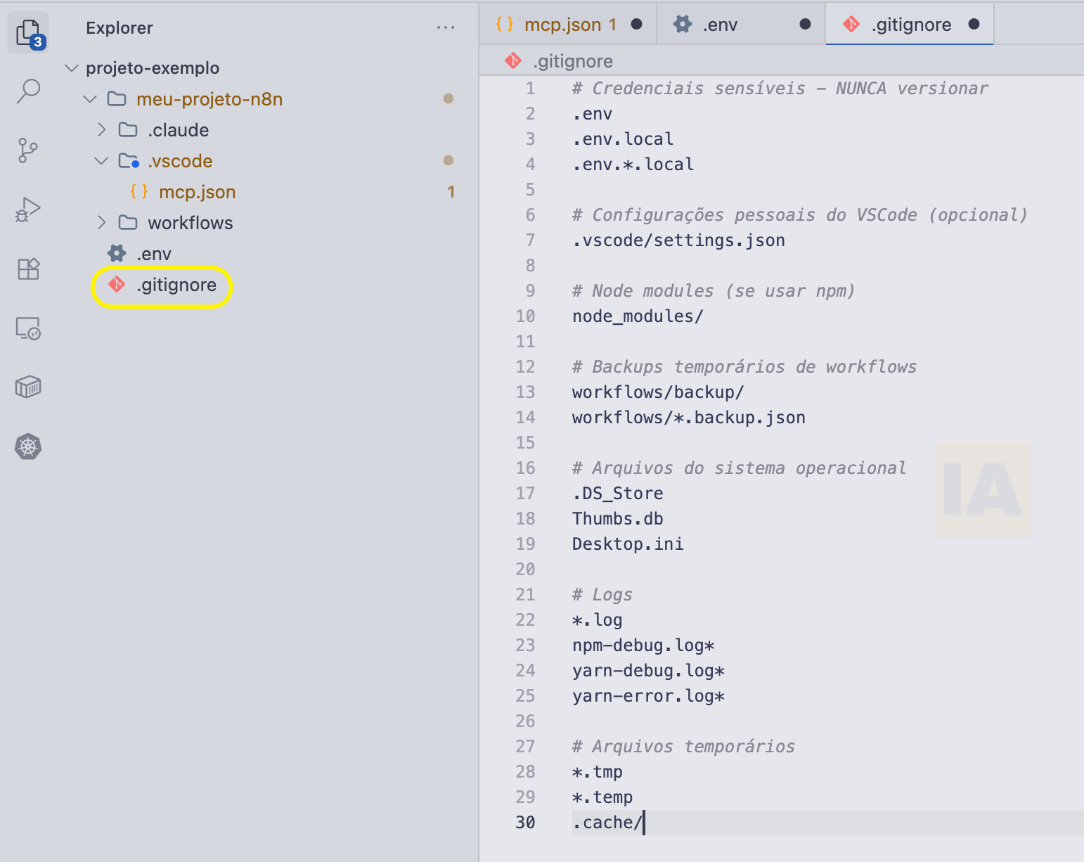 Agora vamos criar a estrutura de arquivos necessária para que o VS Code (ou Cursor) se conecte à sua instância N8N. Essa configuração utiliza o padrão de projeto que permite tanto a integração MCP quanto o versionamento com Git.