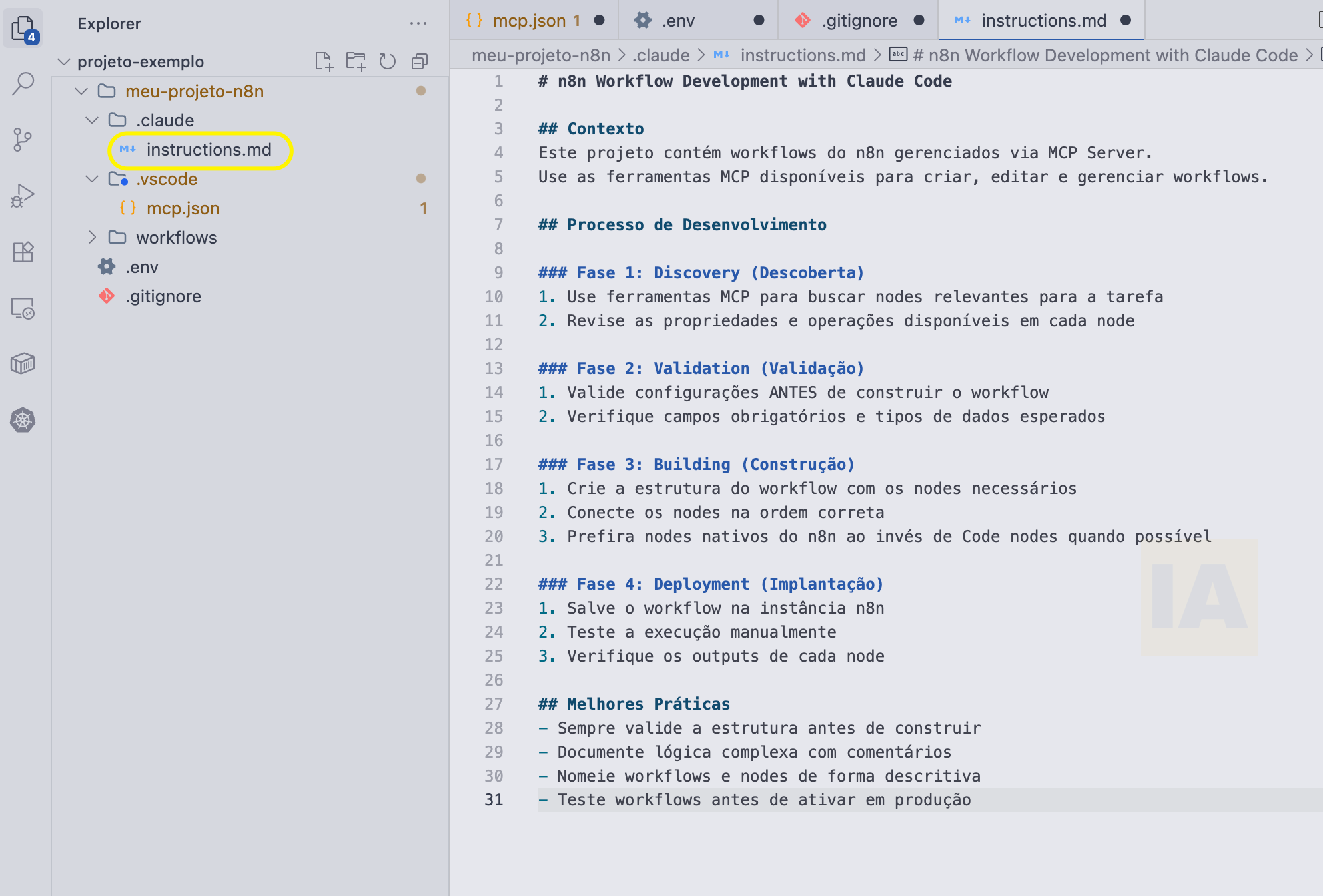 .vscode/- Configurações específicas do VS Code, incluindo o MCP.claude/- Instruções opcionais para o assistente de IAworkflows/- Pasta para armazenar workflows exportados em JSON