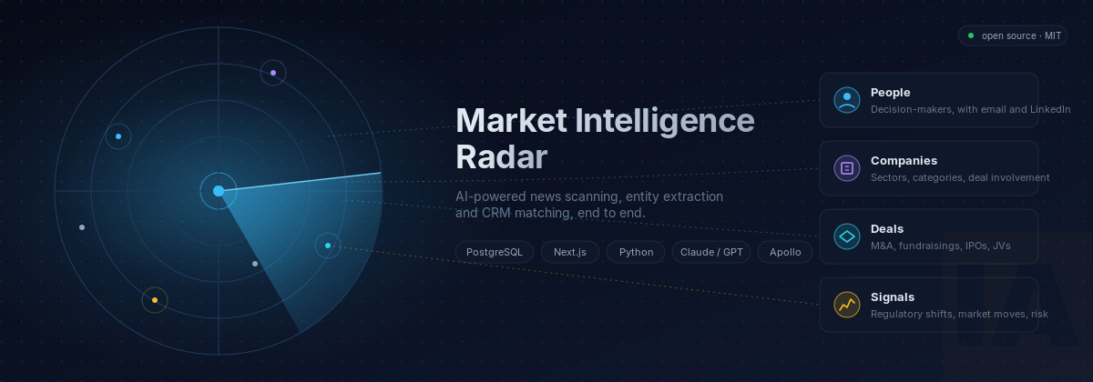 Eu fui esse alguém durante anos. E acabei construindo uma ferramenta para tirar essa rotina das minhas mãos. Chama-se Market Intelligence Radar (MIR). É um pipeline open source que varre fontes de notícias configuráveis, extrai pessoas, empresas, deals e sinais de mercado usando LLMs, faz match com o CRM, enriquece os contatos via Apollo e SalesQL, e mostra tudo num dashboard. Está disponível no GitHub em github.com/guifav/market-intelligence-radar, com licença MIT, sem telemetria, totalmente self-hosted.