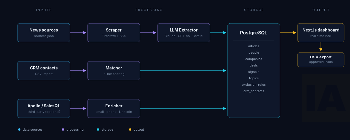 Um pipeline open source que varre fontes públicas, extrai pessoas, empresas e deals com LLM, cruza com seu CRM e entrega tudo num dashboard. Os desafios técnicos e onde mora a oportunidade.