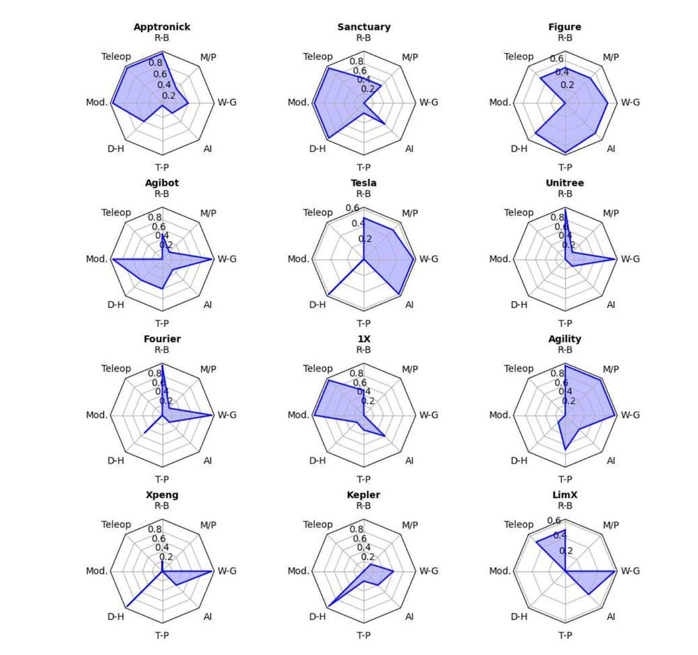 O gráfico acima apresenta uma visão comparativa das empresas mais promissoras que estão investindo em Robótica Humanóide atualmente, avaliando cada uma delas em 8 critérios-chave para o desenvolvimento destes robôs. A análise dos gráficos permite identificar os pontos fortes e fracos de cada empresa, bem como possíveis estratégias e tendências do setor.