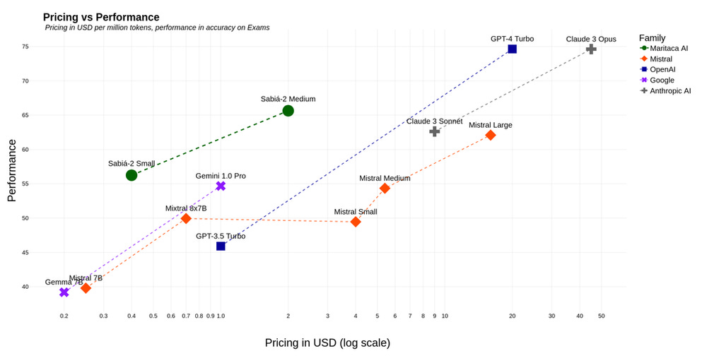 Outro fator importante que vale a menção é seu custo. O gráfico abaixo ilustra a performance e o preço por milhões de tokens. Uma vez que é precificado em Reais, ao contrário do GPT-4 Turbo e o Claude 3 Opus, os dois melhores modelos da atualidade.
