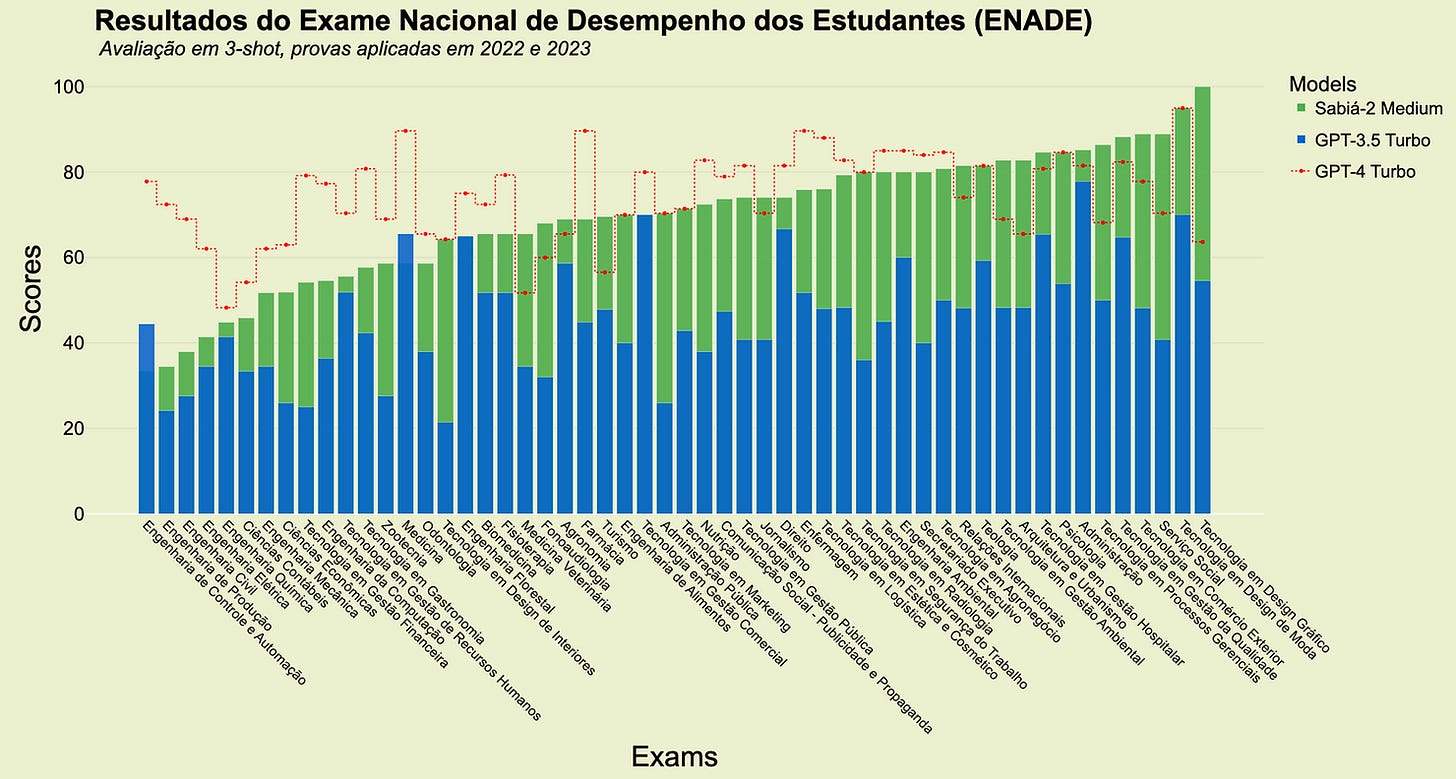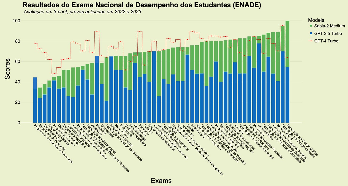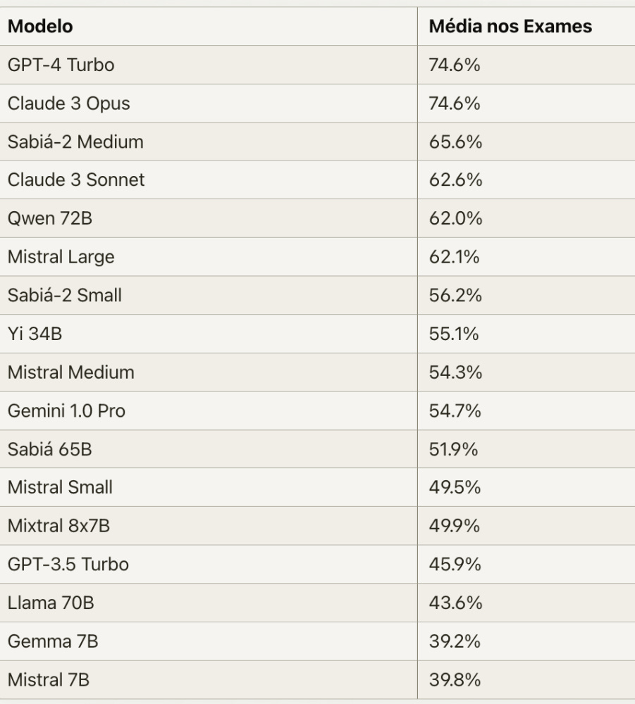 Uma das características mais impressionantes do Sabiá-2 é seu desempenho excepcional em exames brasileiros. Em diversos testes, o modelo demonstrou uma performance que rivaliza e, em alguns casos, até supera a do renomado GPT-4, desenvolvido pela OpenAI.