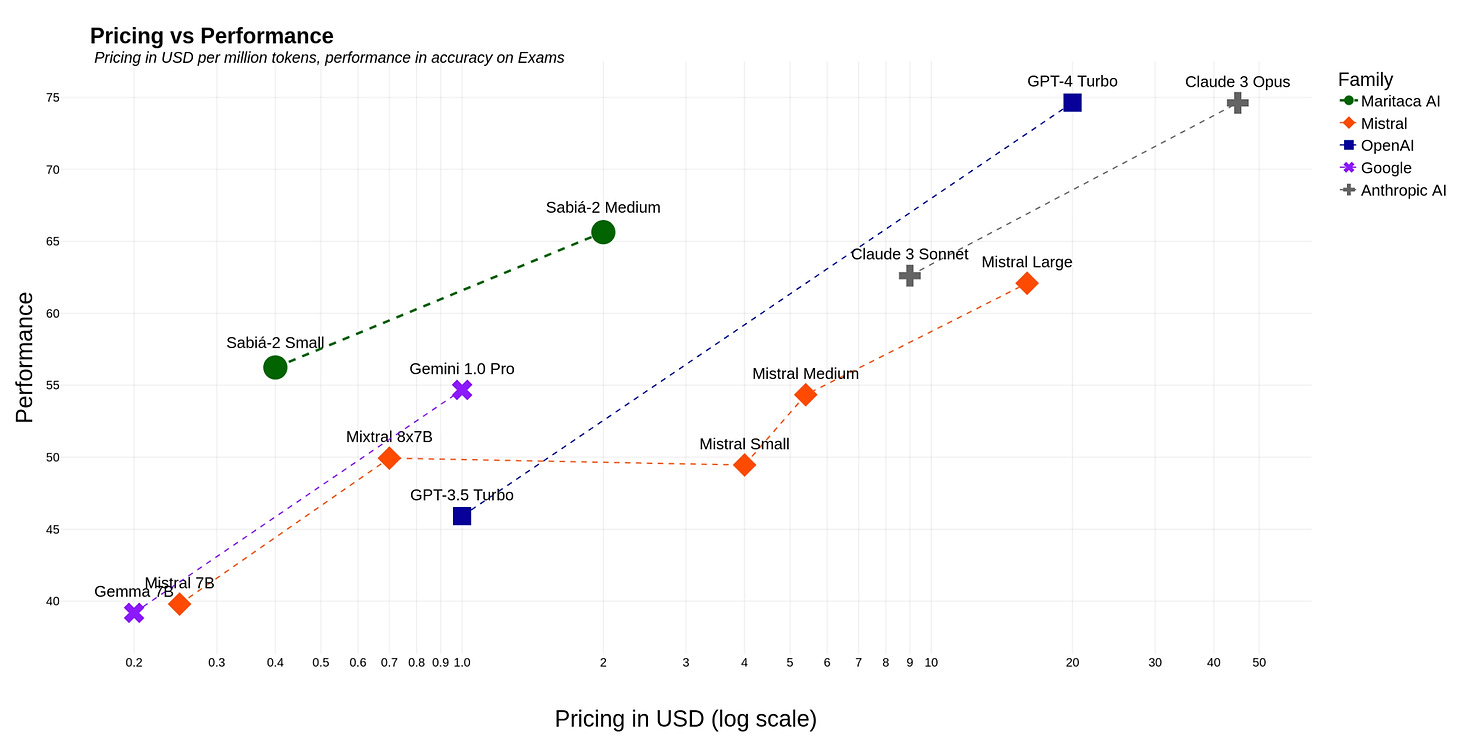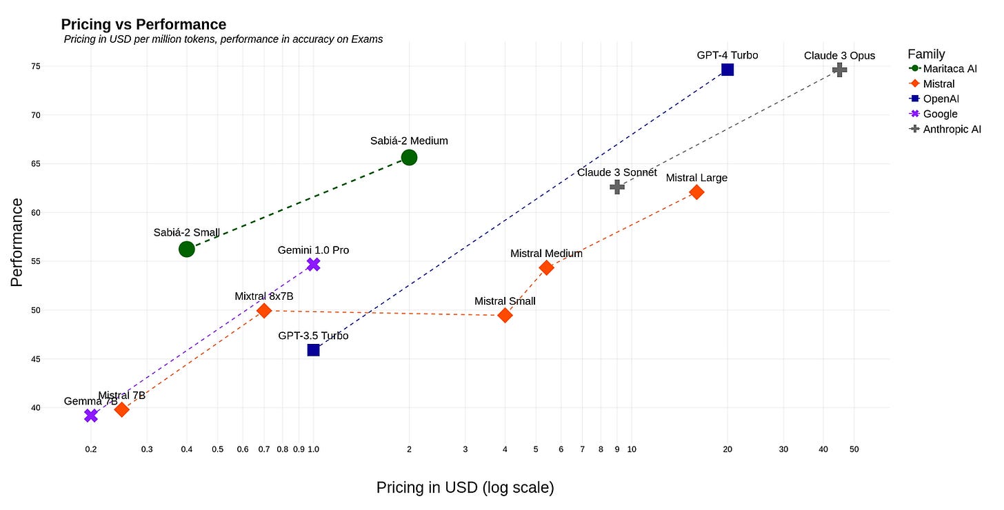 Outro fator importante que vale a menção é seu custo. O gráfico abaixo ilustra a performance e o preço por milhões de tokens. Uma vez que é precificado em Reais, ao contrário do GPT-4 Turbo e o Claude 3 Opus, os dois melhores modelos da atualidade.
