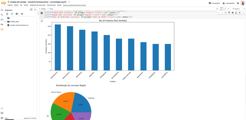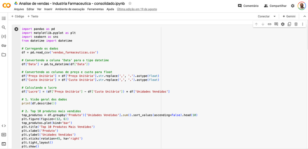 Crie um script Python para analisar um arquivo CSV chamado 'vendas_farmaceuticas.csv' com as colunas: Data, Produto, Região, Vendas e Custos. O script deve: